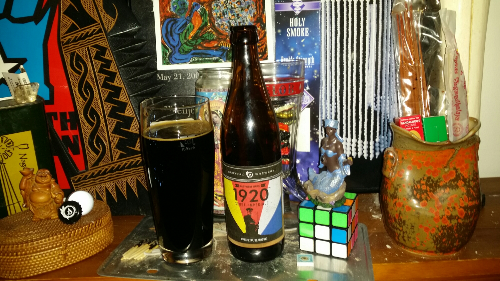 The tastes in 1920 are all over the place. I’m getting sweetness, like dried fruits rolled up into a giant Cuban cigar, smoked and chewed at the same time. But not too much smoke is getting through, which is fitting because this really isn’t a smokebeer. It does say “slight smoke” on the side of the bottle, and the Binny’s computer told me it was, so here we are. Even with the minimal smoke, there is plenty to keep me busy in this glass. A snifter would be more reasonable, but I’m happy with my pint’plus glass. I would be even happier with a bomber, or even a champagne bottle, all poured into a big ole stein, but now I’m getting into the value metric. Beer snobery isn’t a poor man’s game so I come prepared, but it still is frustrating when someone pushes the envelope in regards to getting my money. The taste is robust, asphalty, reminds me of The Bruery Smoking Wood, but less smoking. Destihl musta packed tons of grains and ingredients in there. It was a bold move to age for a year in a French Cognac oak foudre (which means barrel), which yielded a bold beer. Final score – a respectable and expensive 5 out of 7.