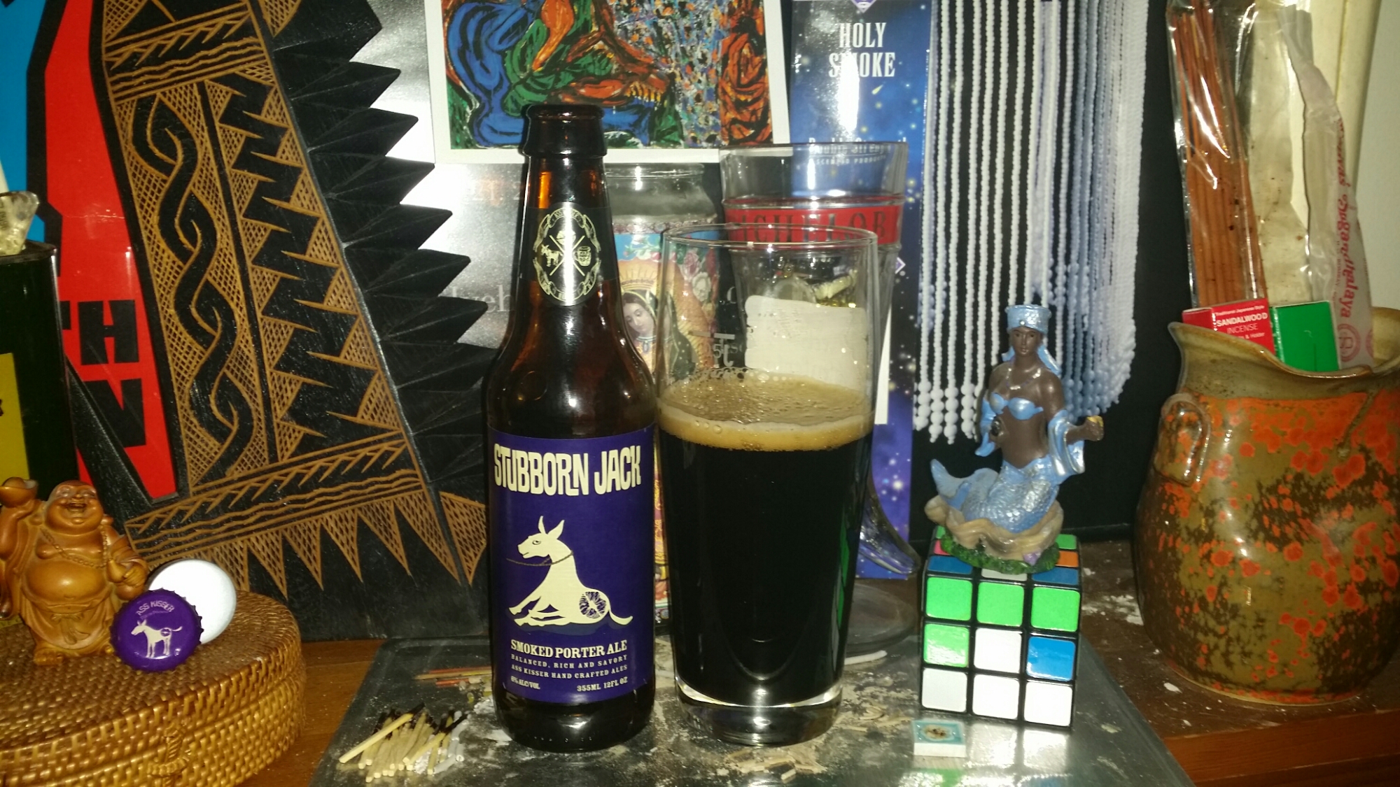 Smells like a thick, rich, and delicious barrel aged smoked beer. Looks and pours like one too. But the taste… where is the taste? My palate was quite prepared for something at the opposite end of the spectrum, but that something never materialized. Stubborn Jack is like a super watered down Fore Smoked Stout. Stubborn Jack might take the cake for misrepresentation. This beer does not walk the walk. Upon further inspection the 6% abv. was one clue. Also, the opacity metric did measure light penetration at 2 inches (meaning there is less substance in the beer to stop light from passing through, even though it is fairly dark, like Coca Cola, it is also thin like coke, and doesn’t lace the inside of a glass very well. But the lack of taste is too surprising. From what I can gather out of this glass includes: slight smoke, slight ash, tastes like a porter (I will give them that), but I will not give them any repeat business. The Ass Kissers Porter Pounder was better… They should make that one again. Overall Smokestack Factor 2 out of 7.