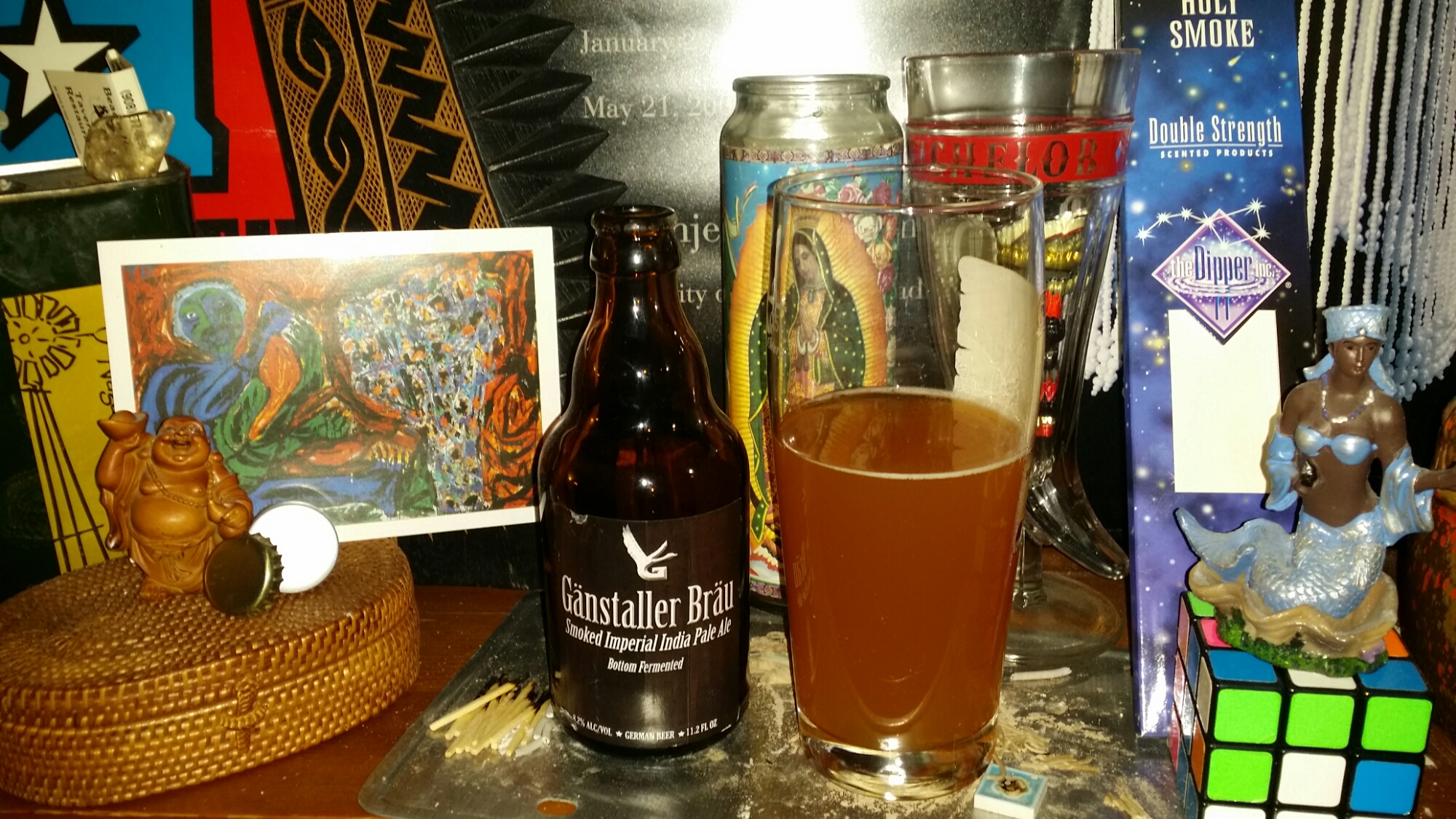 I opened this one up and was greeted with a very pleasant campfire smell which prompted me to say, “oooh!” This bottom fermented Smoked Imperial India Pale Ale poured nice as well and due to my personal pouring technique, the yeast and sediment held in place and did not stir and cloud up the beer at all, which is easy to lose sight of when drinking. Bottom fermenting is unusual in ales because ale is typically thought of as a top fermenting beer (yeast), while lagers are traditionally the bottom fermenting counterpart to the two branches in the trunk of the beer family tree, we’ll have to do more research to see what Michael Jackson had to say about this. The taste held up too with a nice campfire taste to it (not always the case to have the smell profile match the taste) and in this case, it’s pretty close. I’m getting a dry and slightly bitter taste as expected of IPAs, thankfully Gänstaller Bräu did not simply dump a bunch of hops into the brew in the hopes of blowing your fuckin mind, as seems to be the case for about 80% of all breweries 5 years old and younger. No, Gänstaller Bräu’s Smoked Imperial India Pale Ale is clearly steeped in tradition, well refined, where ingredients are used to balance out flavors and add stability to the beer. I don’t have much else to say. Overall desirability quantified in a roundabout analogistic metric where smokestacks represent increments in a bar graph: 5 out of 7 smokestacks.
