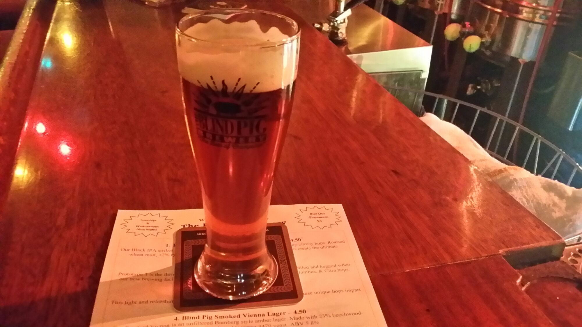 This works! Smells just right and with only 23% beechwood smoked malts. Oftentimes brewers use copious amounts of smoked malts and manage to muddle the flavor up so much that its hard to tell if you are even drinking beer. Not here thankfully. Smells and tastes just like Bamberg intended. I feel that brewers must hammer out what they feel is a good foundation beer before branching out into uncharted libations and The Blind Pig has done that with this great statement beer. It’s as if they are speaking directly to SmokeBeerMinistry and saying, “Yes, we know how to do Rauch, so are we allowed to go forward?” SBM responds with a nod. Chart info is also below, but to sum up (and get this down before I forget); nose -4.5 , smokepower taste- 5, opacity – 3.3, sausage- Y, overall- a respectable 5.8. Much stronger than the across town competitor, but still shy of the 6+ mark, which could probably be achieved by bumping up the smoked malts to 30%-35% range… maybe more. Well done Blind Pig, quite the refuge in the middle of an Illinois February.